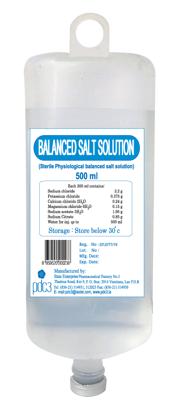 ຊື່ການຄ້າ/Product Nam: RINGER LACTATE ສ່ວນປະກອບ/ Composition Each 100ml contains: Sodium chloride 600mg Sodium lactate 300mg Potassium chloride 40mg Calcium chloride 2H2O 27mg Water for injection q.s to 100ml ຂະໜາດ Size: 500ml/ 1000ml ການບັນຈຸ / Packaging: 20 set /carton / 10 set/carton ຄຸນປະໂຫຍດ Indication - ໃຊ້ທົດແທນພະລັງງານ ແລະ ເກືອແຮ່ກ່ອນ ແລະ ຫຼັງການຜ່າຕັດ - ໃຊ້ສຳລັບຄົນເຈັບທີ່ຂາດນ້ຳ ແລະ ທາດນ້ຳຕານໃນຮ່າງກາຍ - Used for energy and mineral salts replacement before and after surgery - Used for patients who are dehydration and hypoglycemia ຊື່ການຄ້າ/Product Nam: SODIUM CHLORIDE 0.9% ສ່ວນປະກອບ/ Composition Each 100ml contains: Sodium chloride 900mg Water for injection q.s to 100ml ຂະໜາດ Size: 100m/ 500ml/ 1000ml ການບັນຈຸ / Packaging: 50 set/ carton/ 20 set /carton / 10 set/carton ຄຸນປະໂຫຍດ Indication - ໃຊ້ທົດແທນພະລັງງານ ແລະ ເກືອແຮ່ກ່ອນ ແລະ ຫຼັງການຜ່າຕັດ - ໃຊ້ສຳລັບຄົນເຈັບທີ່ຂາດນ້ຳ ແລະ ທາດນ້ຳຕານໃນຮ່າງກາຍ - Used for energy and mineral salts replacement before and after surgery - Used for patients who are dehydration and hypoglycemia ຊື່ການຄ້າ/Product Nam: BALANCED SALT SOLUTION ສ່ວນປະກອບ/Composition Each 100ml contains: Sodium chloride 3.2g Potassium chloride 0.375g Calcium chloride 2H2O 0.24g Magnesium chloride 6H2O 0.15g Sodium acetate 3H2O 1.95g Sodium Citrate 0.85g Water for inj q.s to 500ml ຂະໜາດ Size: / 500ml/ ການບັນຈຸ / Packaging: 20 set /carton / 10 set/carton ຄຸນປະໂຫຍດ Indication ຊື່ການຄ້າ/Product Nam: D-WATER ສ່ວນປະກອບ/ Composition Each 100ml contains: SNon Pyrogenic Water ຂະໜາດ Size: 1000 ml/ 20 lite ການບັນຈຸ / Packaging: 10 set/ carton ຄຸນປະໂຫຍດ/ Indication