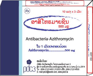 ຊື່ການຄ້າ/ Product Name: AZITHROMYCINE ສ່ວນປະກອບ/ Composition Each 100mg contains: Azithromycin 500mg ຂະໜາດ Size: 500mg ການບັນຈຸ / Packaging: 3 tabs x 10 BL x 160 box/carton