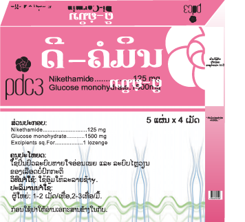 ຊື່ການຄ້າ/ Product Name: DI-CORMIN ສ່ວນປະກອບ/ Composition Each 100mg contains: Nikethamide 125mg Glucose monohydrate 1500mg ຂະໜາດ Size: 125mg ການບັນຈຸ / Packaging: 4 tabs x 5 BL x 108 box/carton