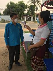 1. ວັດແທກ ອຸ່ນຫະພູມຮ່າງກາຍ ສອງເທື່ອຕໍ່ມື້ (ເຊົ້າ-ແລງ), ສັງເກດຕົນເອງວ່າມີການໄຂ້,ໄອ ຫຼື ຫາຍໃຈຍາກ ແລະ ອາການອື່ນໆ.
